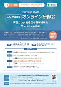 この度、東京都では3月1日(日)に「新型コロナ後遺症の最新情報とME/CFSの臨床」と題し、オンライン研修会を開催することになりました。今回は、本研修会では、コロナ後遺症のME/CFS(※)の臨床について専門家から解説いただくとともに、後遺症研究の最新情報を共有いただきます。