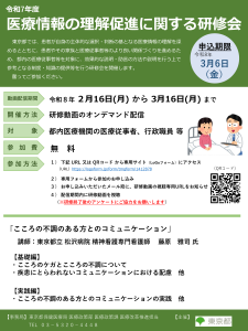 東京都では、患者が自身の主体的な選択・判断の基となる医療情報の理解を深めるとともに、患者やその家族と医療従事者等のより良い関係づくりを進めるため、都内の医療従事者等を対象に、効果的な説明・助言の方法や説明を行う上で参考となる制度・知識の提供等を行う研修会を開催します。奮ってご参加ください。