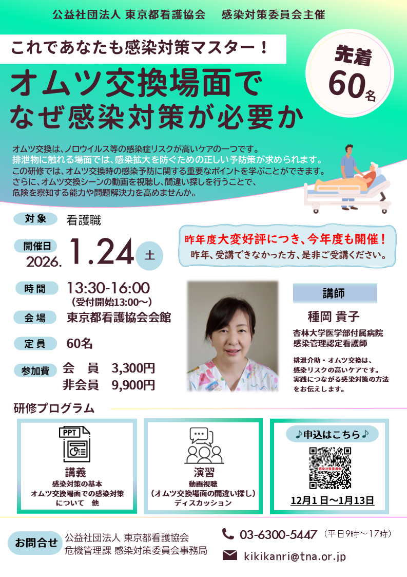 オムツ交換はノロウイルス等の感染症リスクが高いケアの一つです。排泄物に触れる場面では、感染拡大を防ぐための正しい予防策が求められます。この研修では、オムツ交換時の感染予防に関する重要なポイントを学ぶことができます。