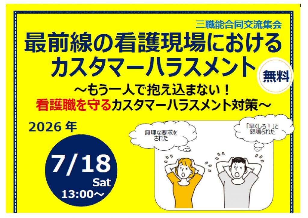 | 開催日 | 令和7年7月19日(土)午後1時~5時 定員300名:ハイブリッド開催 第1部:各職能別交流集会 集合開催:東京都看護協会 各研修室 第2部:三職能合同交流集会 基調講演・シンポジウム 集合開催:東京都看護協会大研修室、Zoomライブ配信 |