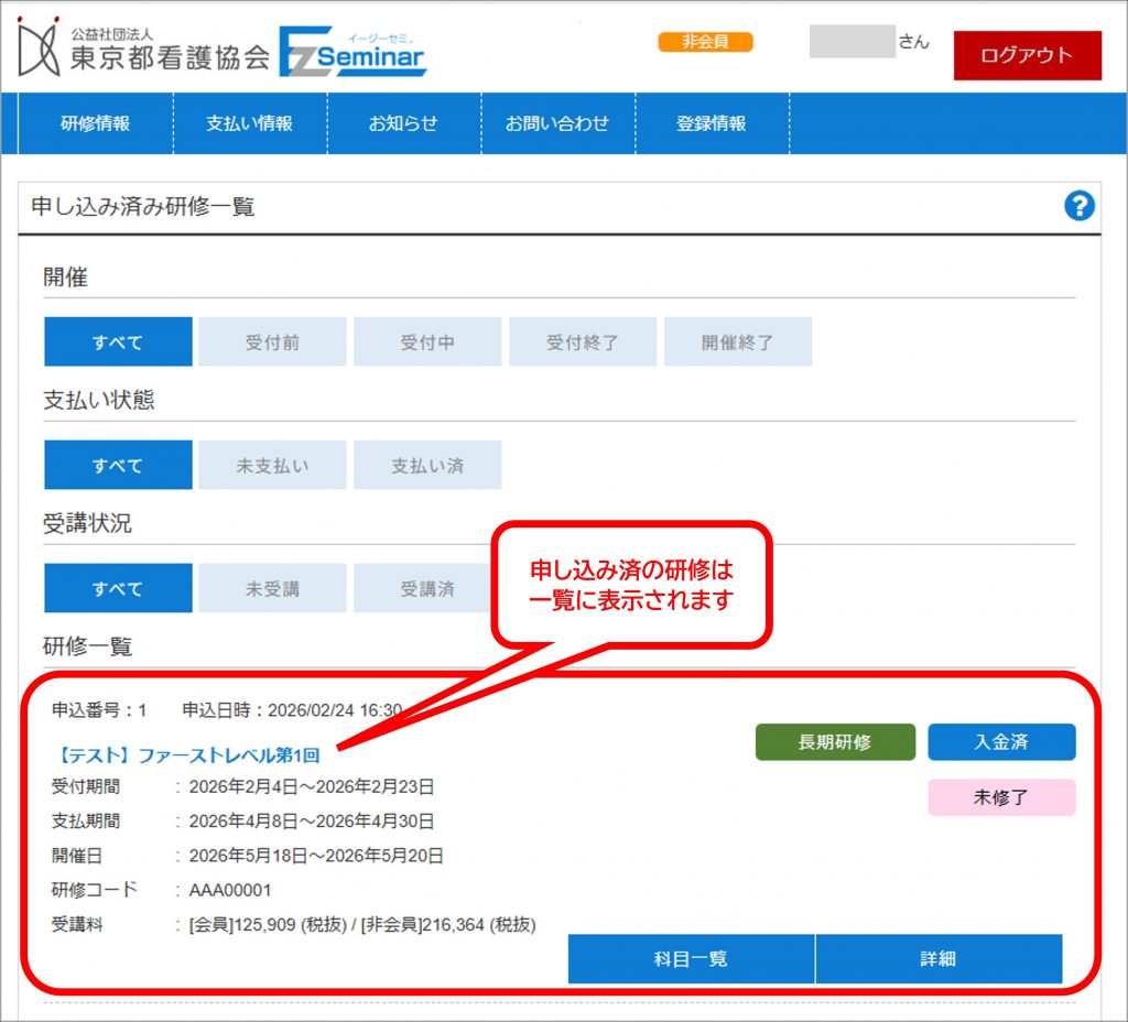 ※ 申し込んだはずの研修が表示されない場合は、「申し込み済み研修一覧」の「開催」「支払い状況」「受講状況」が全て「すべて」になっているかご確認ください。